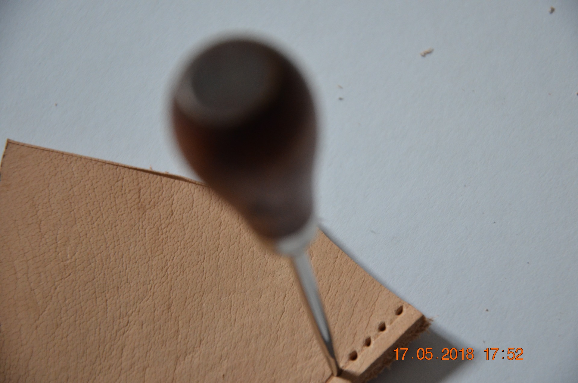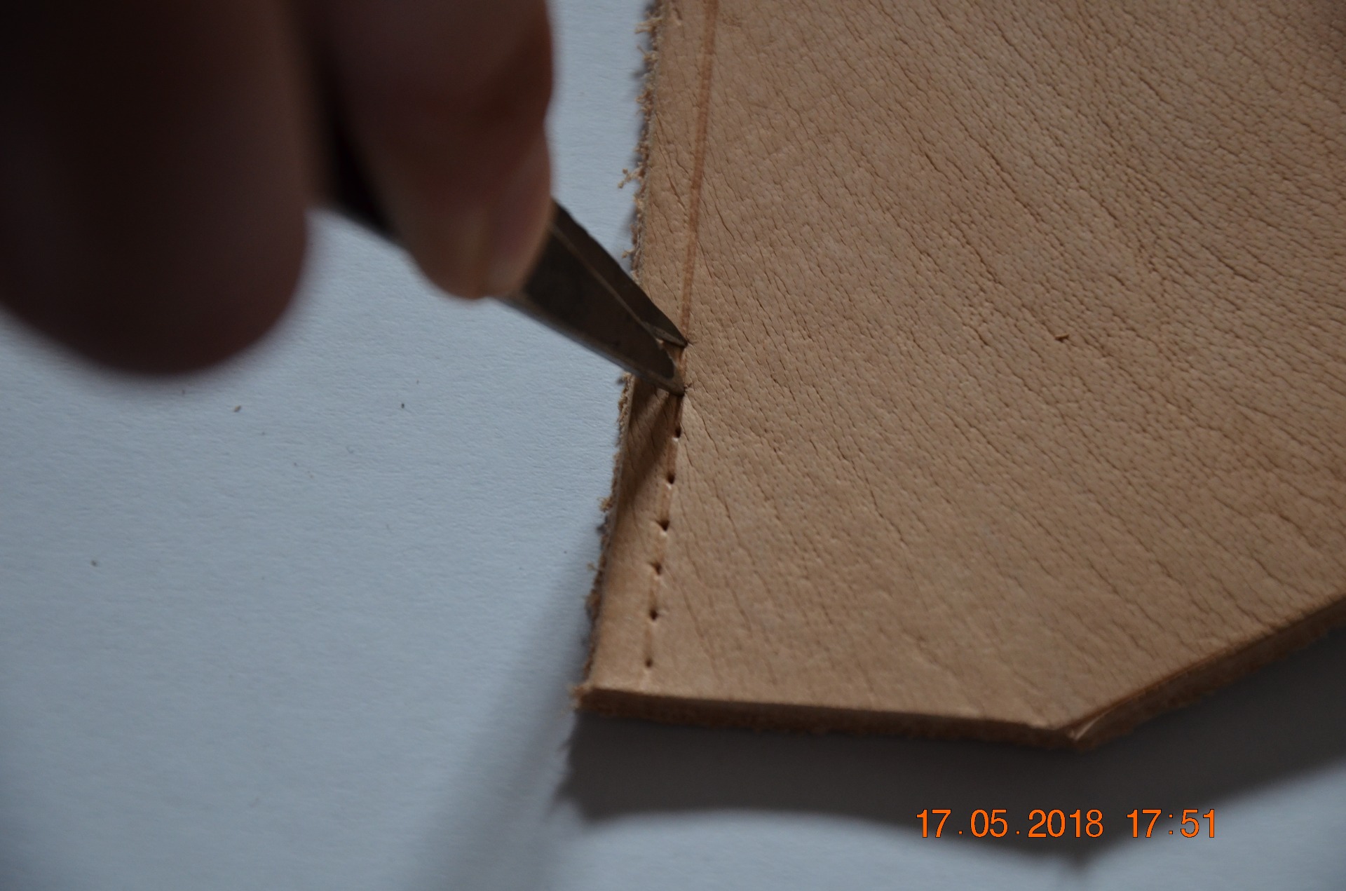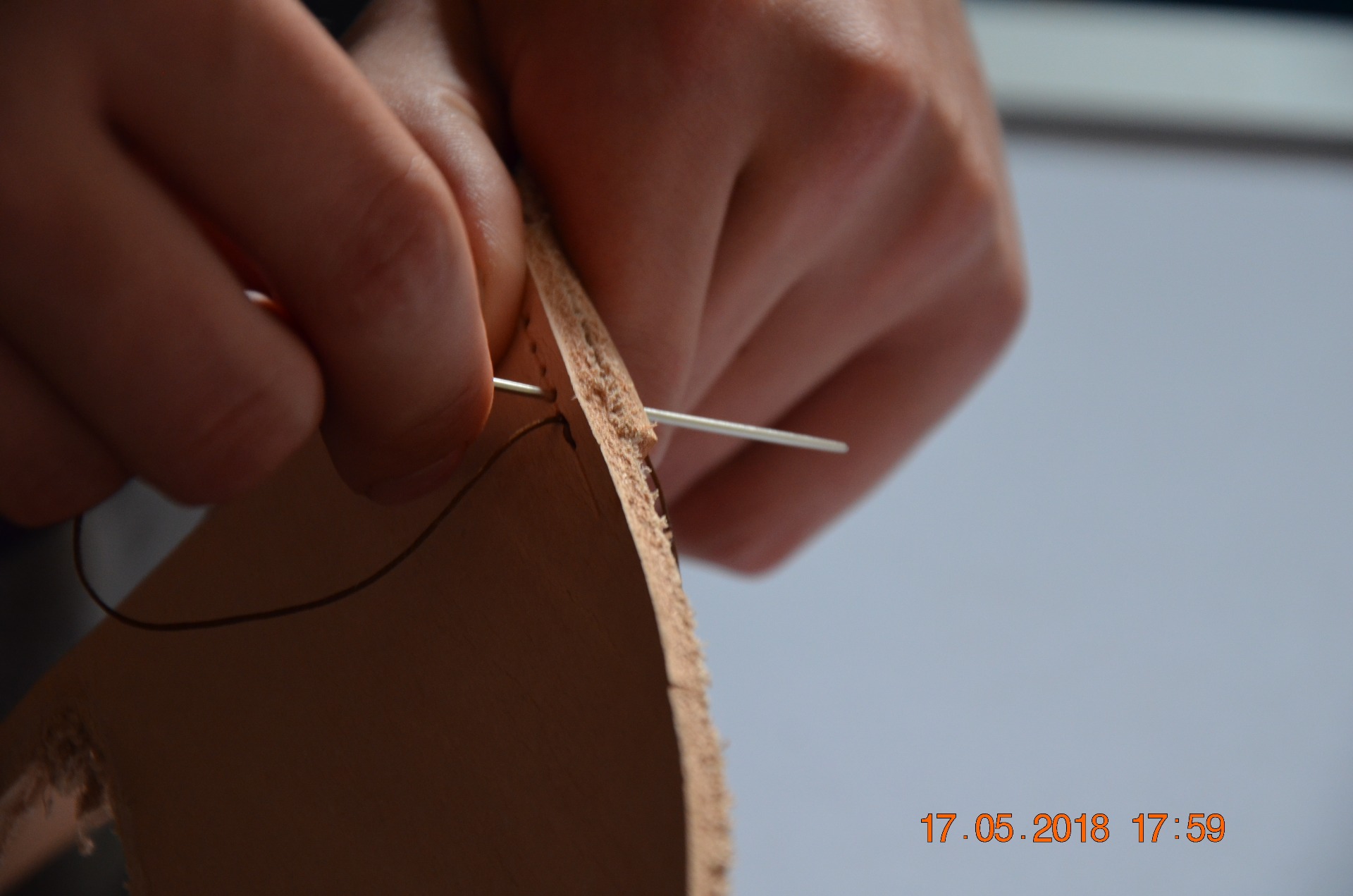 Všetko zašívam ručne dierku po dierke sedlárskym stehom (dve ihly). Na šitie používam ľanovú alebo polyesterovú niť.